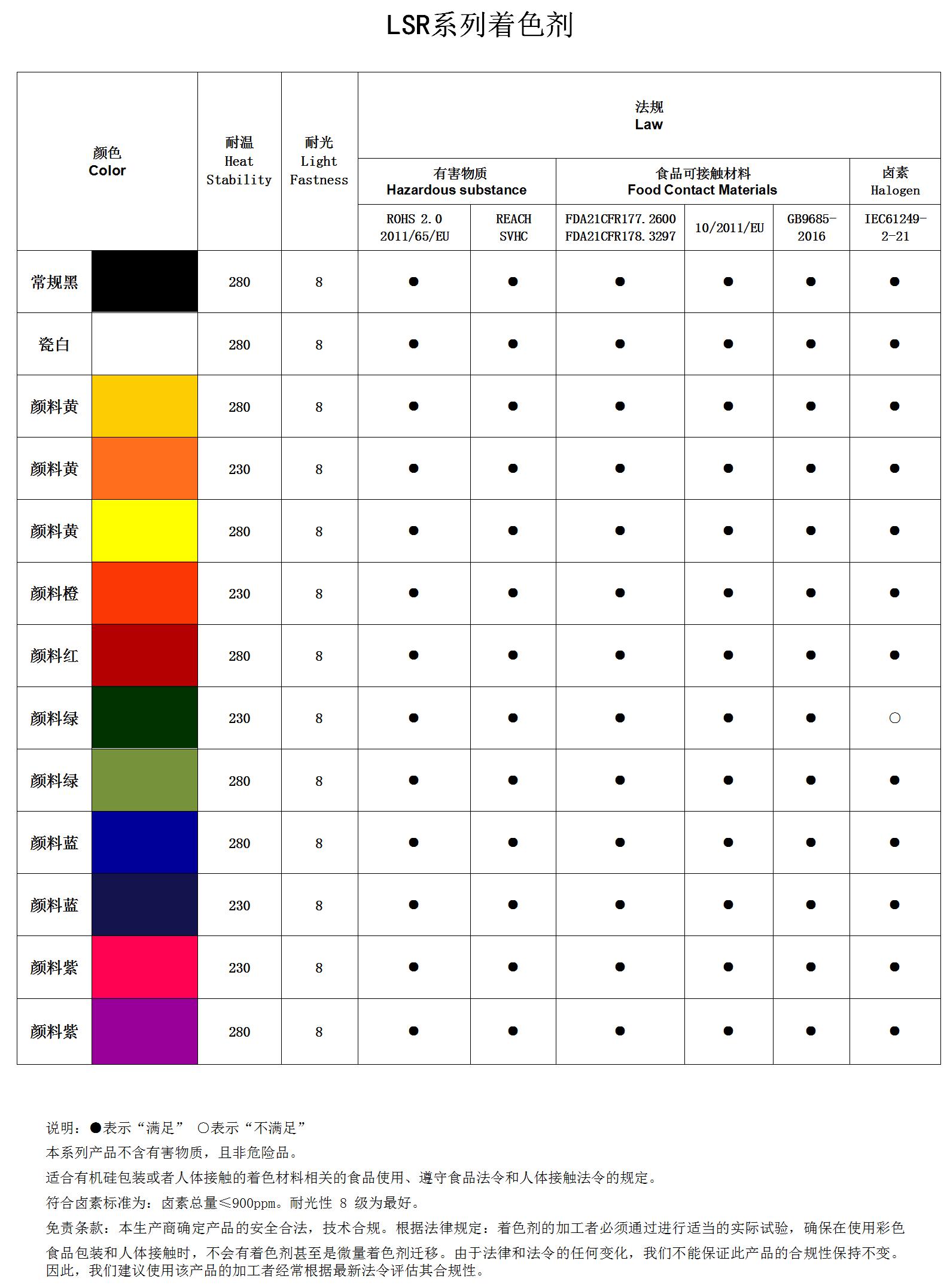 适合有机硅包装或者人体接触的着色材料相关的食品使用、遵守食品法令和人体接触法令的规定。