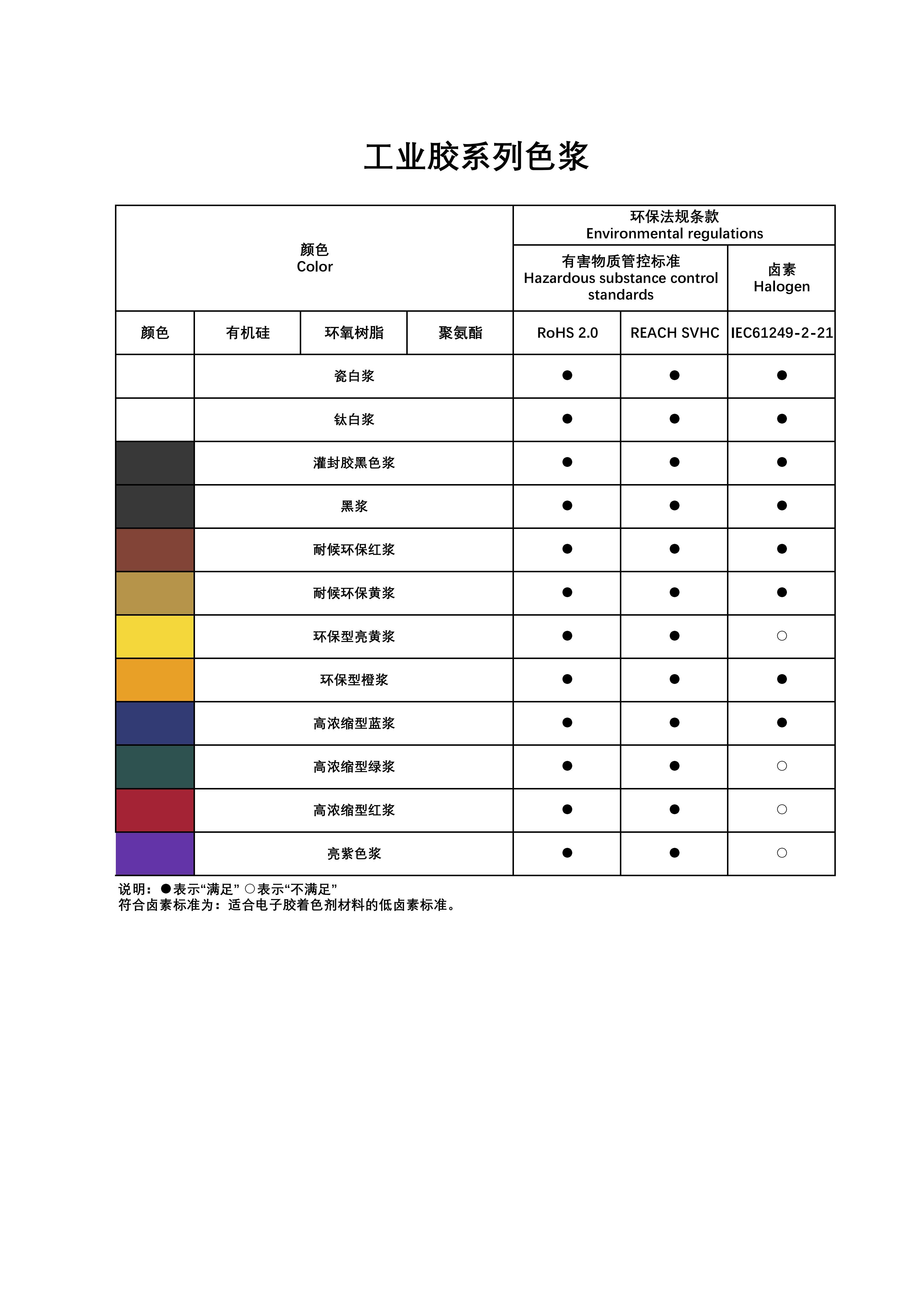 满足有机硅、环氧和聚氨酯体系产品的色彩需求,应用于汽车用胶、灌封、光伏胶产品、聚氨酯涂料、环氧地坪等工业产品的着色。